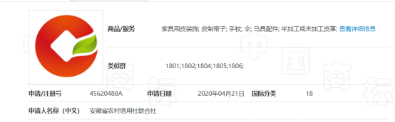 因认为安徽省农村信用社联合社的一枚图形商标(第45620488A号)与其商标近似且侵犯其著作权,在该商标公告期内,中国建设银行股份有限公司对其提出异议请求。商标局审理认为:被异议商标指定使用商品与异议人引证商标核定使用服务不属于类似商品或服务,因此双方商标未构成使用于类似商品或服务上的近似商标。但被异议人将与异议人享有著作权的作品相近似的图案作为商标申请注册,已构成对异议人著作权的损害,故商标局决定:第45620488A号“图形”商标不予注册。小编查询,目前该枚商标进入不予注册复审流程。