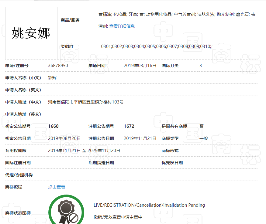 第36878950号“姚安娜”商标无效宣告案。严厉打击损害公众人物姓名权(包括本名、艺名、译名、别名)或其他不正当手段取得注册。