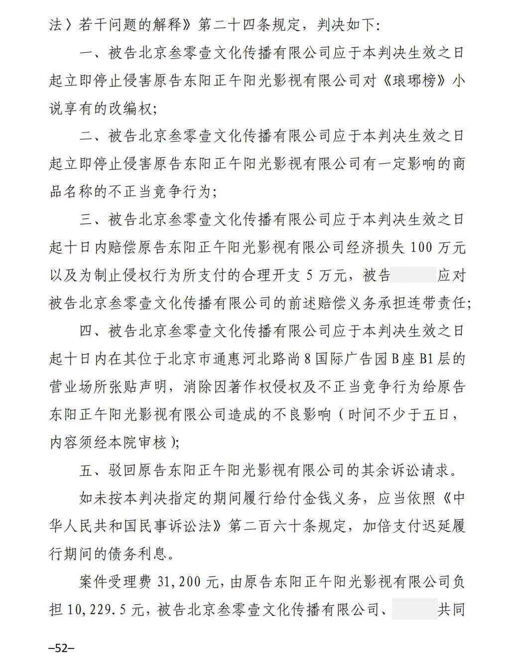 近日,“正午阳光”诉“301密室”著作权侵权及不正当竞争案件在上海市杨浦区人民法院宣判,法院判决被告立即停止对《琅琊榜》作品的著作权侵权行为、立即停止使用“琅琊榜”名称的不正当竞争行为,同时判令被告赔偿原告经济损失及合理费用共计人民币105万元、并在其经营场所张贴声明消除影响。该判决现已生效。