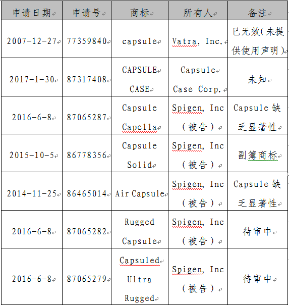 原告Uncommon,LLC于2015年12月向美国伊利诺伊北区联邦法院对被告SPIGEN,INC.提起了商标侵权诉讼;被告则向法院申请撤销原告的capsule商标。