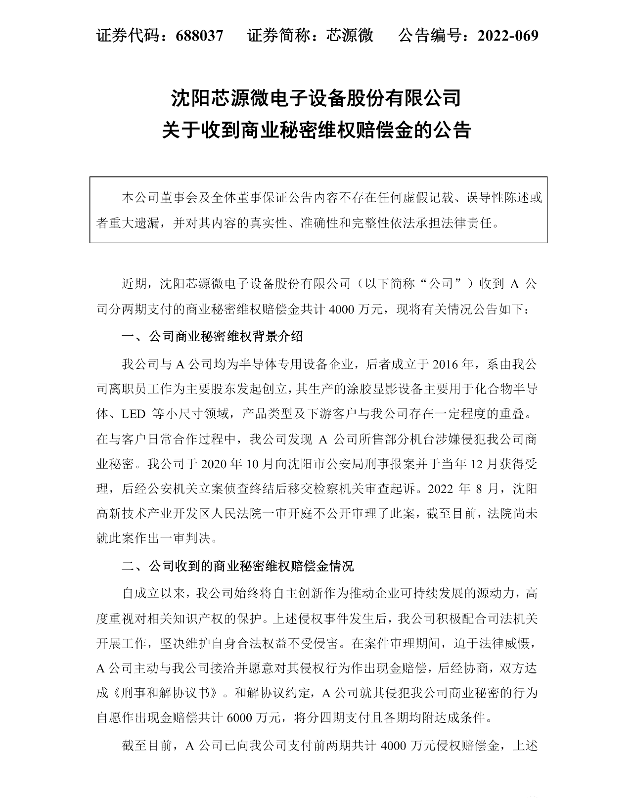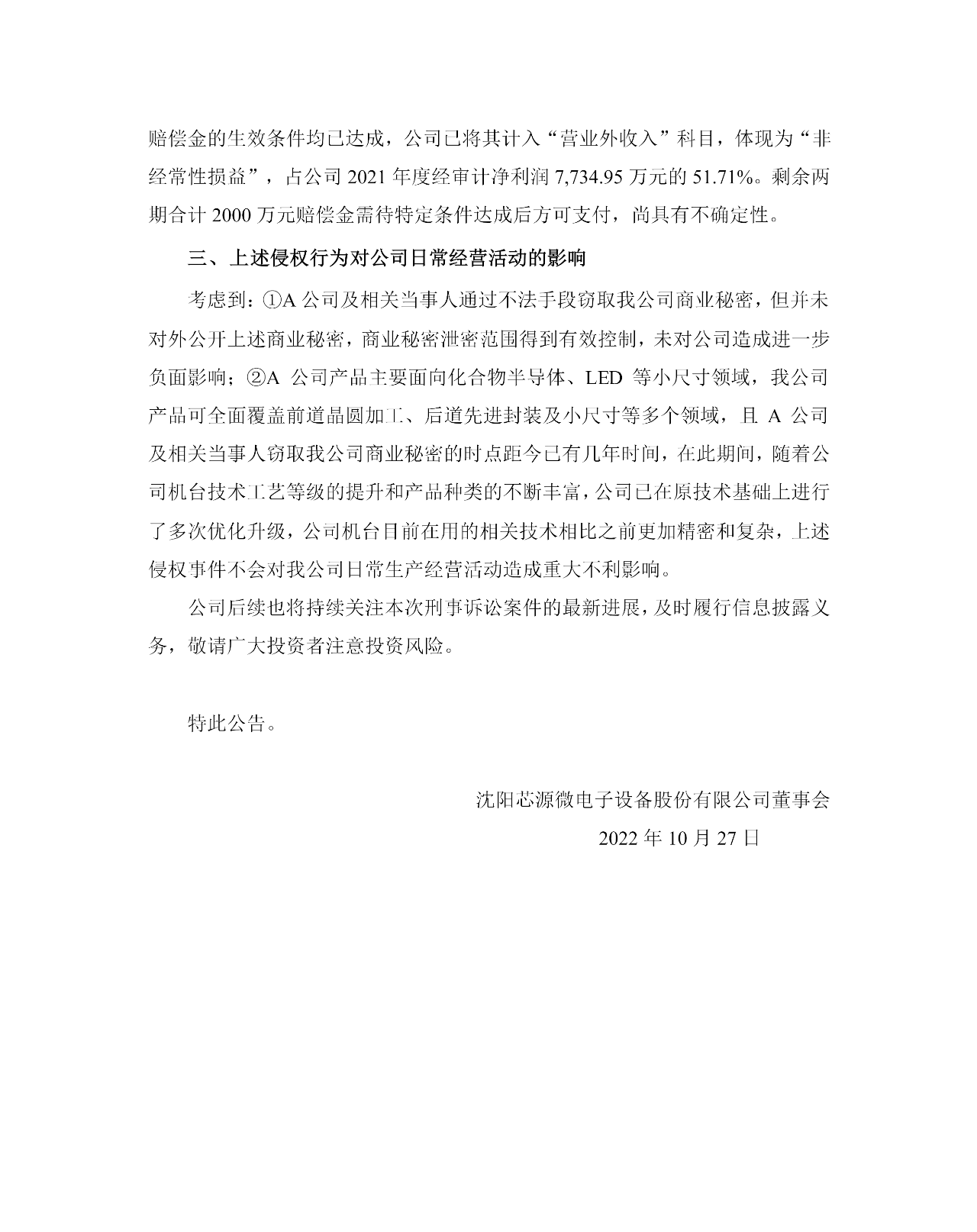 在与客户日常合作过程中,公司发现A公司所售部分机台涉嫌侵犯公司商业秘密。公司于2020年10月向沈阳市公安局刑事报案并于当年12月获得受理,后经公安机关立案侦查终结后移交检察机关审查起诉。