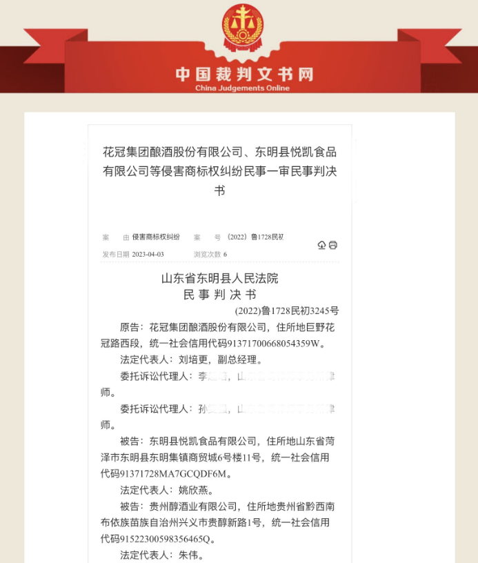 4月3日,据中国裁判文书网了解到,山东省东明县人民法院对贵州醇酒业有限公司侵犯花冠公司系列“金贵”注册商标专用权的侵权行为做出判决,贵州醇酒业有限公司因侵害商标权被罚15万元。