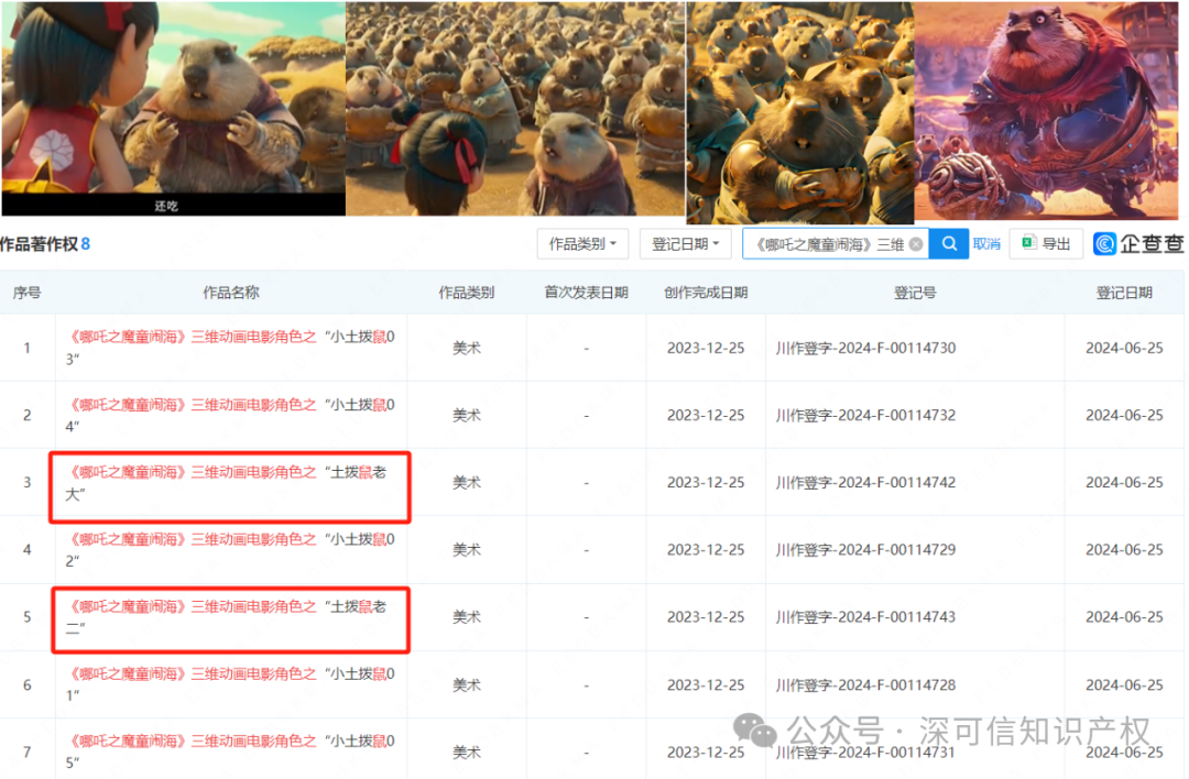 无论是主角哪吒与敖丙,还是配角如帅爹敖光、妩媚的敖闰,甚至是影片中呆萌无害的土拨鼠,都进行了著作权登记。此外,石矶娘娘、无量仙尊等角色及其变形形态,也都纳入了著作权保护的范围。