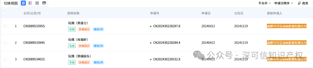 目前,成都可可豆动画与成都自在境界文化两家出品公司,已经成功公开了多项与电影角色玩偶设计相关的外观专利。这些专利涵盖了多个深受观众喜爱的角色,如玉虚宫捕妖队的成员、嘲笑哪吒的小道士等。有效防止了未经授权的周边产品制作与销售行为。这些角色的外观专利在2024年4月22日正式提交申请,并在同年年底成功获得了授权公告。