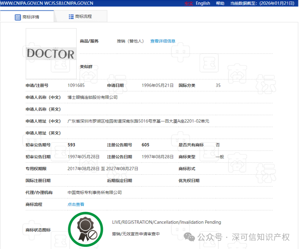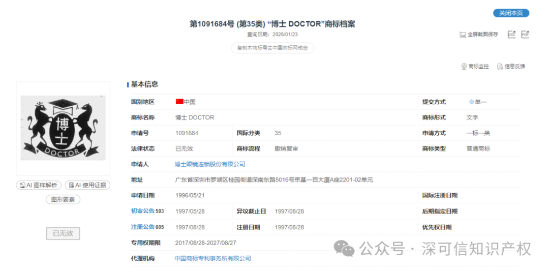 更值得注意的是,此次并非博士眼镜第一次商标被撤销。其旗下另一枚“DOCTOR”商标也因同样理由面临撤销风险,凸显其商标管理体系的深层隐患。