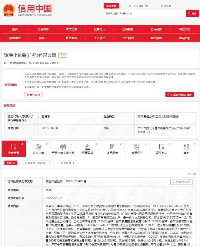 据信用中国,近日,PANDAS BEAUTY关联公司X化妆品(广州)有限公司因商标侵权违法行为,被广州市白云区市场监督管理局罚款6000元。