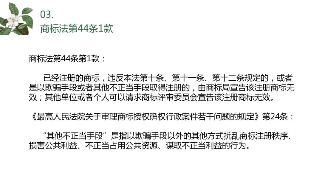 该条款是打击恶意注册行为的一条兜底性条款,根据《最高人民法院关于审理商标授权确权行政案件若干问题的规定》第24条的规定,“其他不正当手段”是指以欺骗手段以外的其他方式扰乱商标注册秩序、损害公共利益、不正当占用公共资源、谋取不正当利益的行为。