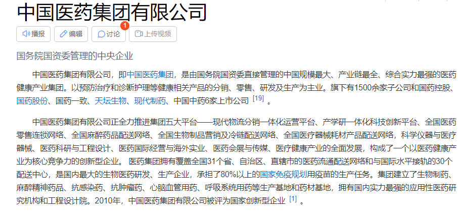 那么,国药集团、中国生物呢?百度百科资料显示,中国医药集团有限公司(简称“国药集团”),是由国务院国资委直接管理的中国规模最大、产业链最全、综合实力最强的医药健康产业集团。