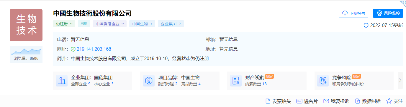 企查查显示,中国生物技术股份有限公司(“中国生物”)始于1919年,前身为北洋政府中央防疫处,新中国成立后直属卫生部领导,现为世界500强中国医药集团有限公司的重要成员企业,是中国历史悠久、产品全、规模大,集科研、生产、销售以及研究生培养为一体的综合性生物制药企业。