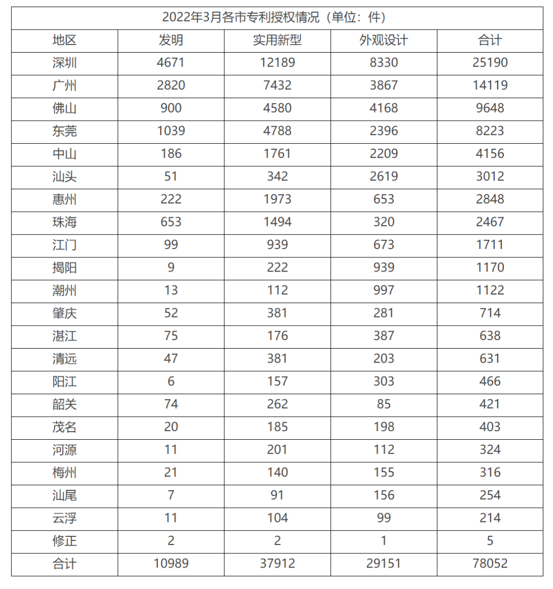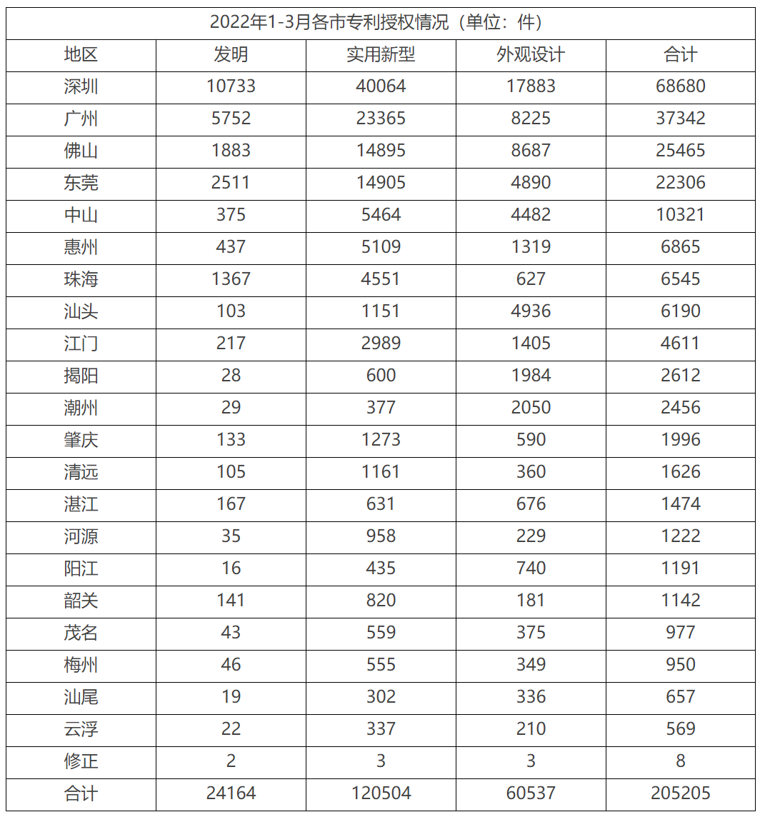 近日,广东省市场监督管理局发布了2022年3月各市专利授权情况、2022年1-3月各市专利授权情况 。深可信特此将其汇总以便读者查阅。