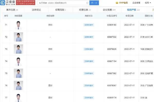 企查查 APP 显示,近日,东方优选(北京)科技有限公司申请注册多个东方臻选直播间主播肖像商标,包括 " 董宇辉、孙佳琦、孙楚涵 " 等人肖像。据悉,这些商标的国际分类包含教育娱乐、广告销售、农林生鲜、办公用品等,目前商标进度为:注册申请中。