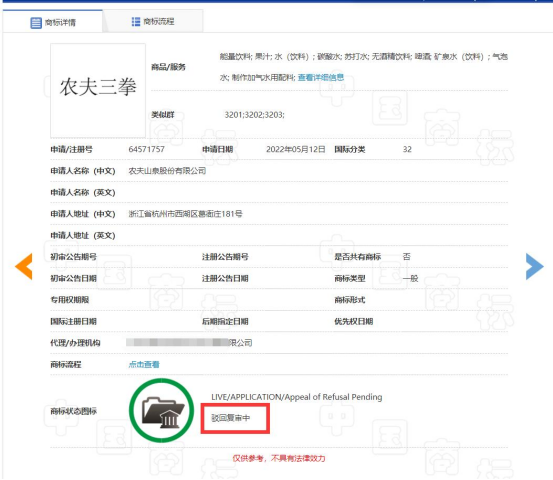 据中国商标网显示农夫山泉股份有限公司于今年5月又申请注册的“农夫三拳”商标。指定使用在第32类啤酒饮料等商品及服务上,目前商标状态为“驳回复审中”。