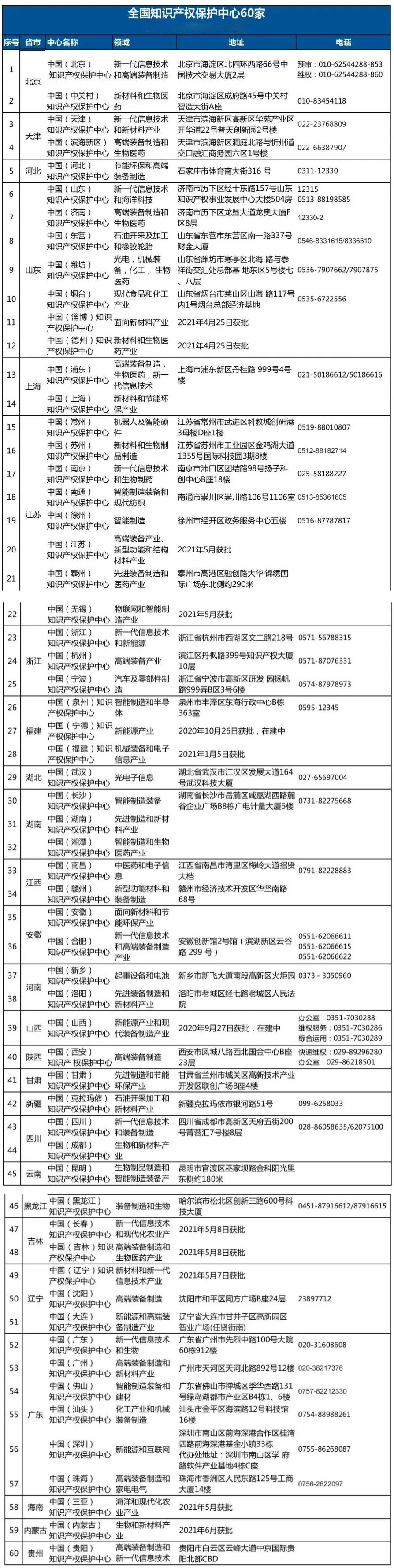汇总丨全国知识产权保护中心及分类号(含地址电话)