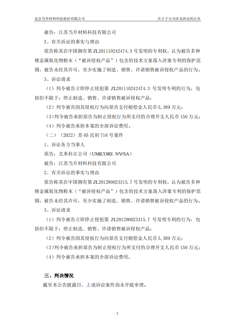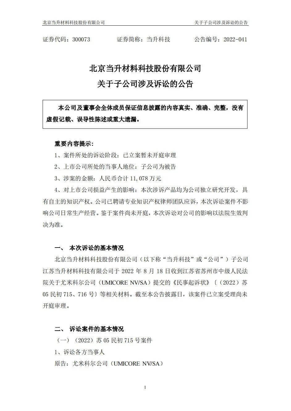公告中称,北京当升材料科技股份有限公司子公司江苏当升材料科技有限公司于2022年8月18日收到江苏省苏州市中级人民法院关于尤米科尔公司提交的《民事起诉状》〔(2022)苏 05 民初 715、716 号〕等相关材料。截至本公告披露日,该案件已立案受理尚未开庭审理。