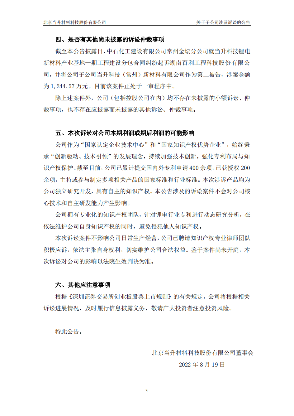 8月19日,北京当升材料科技股份有限公司发布子公司涉诉公告。