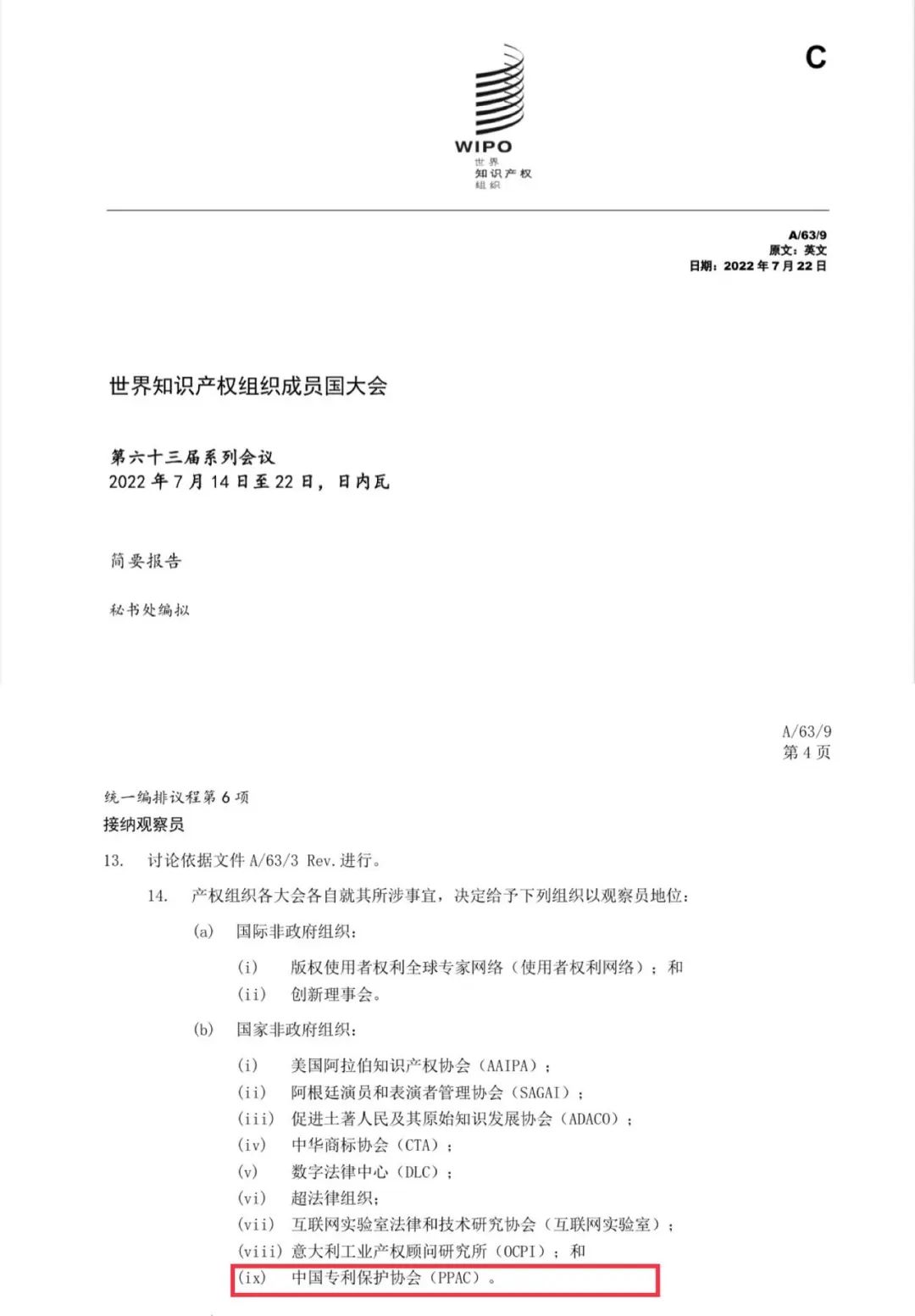 2022年7月, 世界知识产权组织(WIPO)成员国大会 第63届系列会议以实体加线上的混合模式 在瑞士日内瓦召开, 会议审议通过 中国专利保护协会 成为世界知识产权组织观察员。