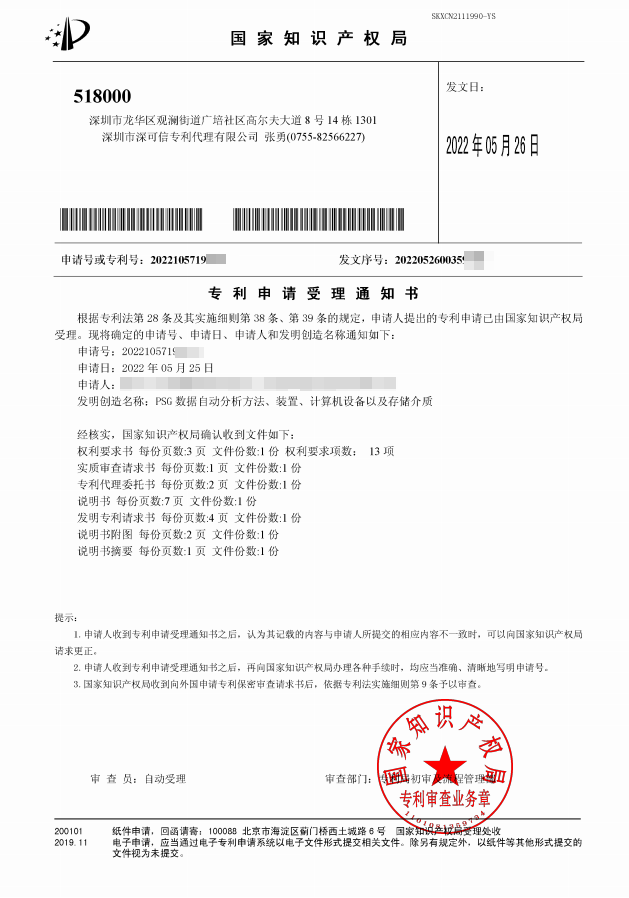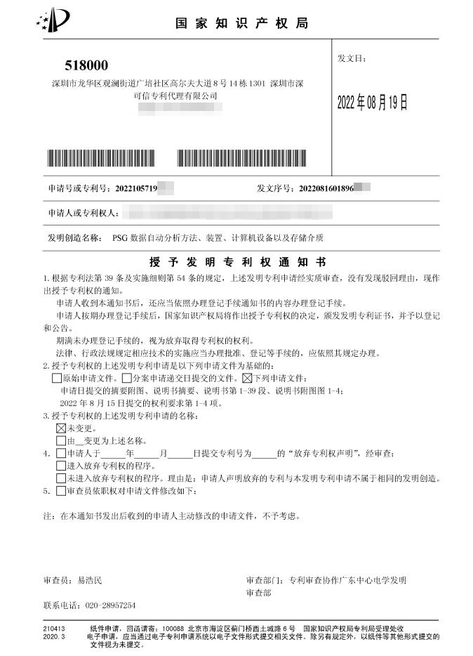 近日,由深圳市深可信专利代理《PSG数据自动分析方法、装置、计算机设备以及存储介质》的发明专利顺利通过国家知识产权局审查,获得国家发明专利授权。