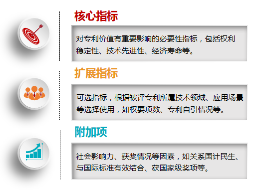 该指引对于专利价值分析评估指标进行了优化,除却27项核心指标外,增加了若干项扩展指标,以及设立附加项。其中,核心指标指对专利价值有重要影响的必要性指标;扩展指标为可选指标,根据被评专利所属技术领域、应用场景等选择使用;附加项指标主要包括专利是否为关键领域核心技术攻关等重大创新成果,是否为标准必要专利等对产业具有控制力的核心专利,是否获得国家级科技或专利奖项等指标。