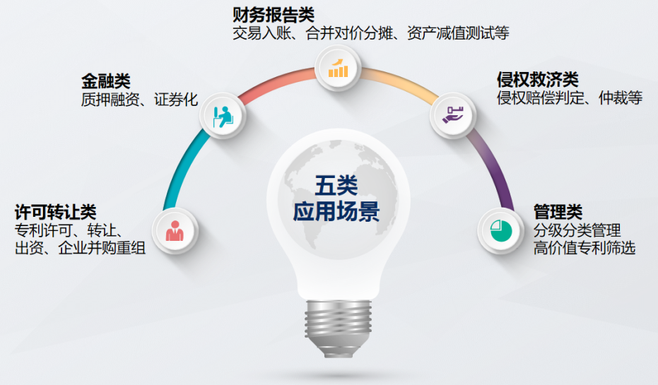 专利评估的应用场景具体涉及五大类:1)许可转让类,包括专利许可、专利转让、专利出资、企业并购重组等;2)金融类,包括专利质押融资、专利证券化等;3)财务报告类,包括知识产权交易入账、合并对价分摊、资产减值测试等;4)侵权救济类,包括侵权赔偿判定、仲裁等;5)管理类,主要涉及专利分级分类管理,其中高价值专利筛选为常见情形。