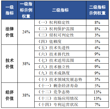 指引还以示例的形式给出某些具体场景下,如何利用层次分析法,根据各指标间的相互重要程度进行赋值来调节各指标的权重。如,专利转让场景下,根据专家经验,适当调高技术价值和经济价值的权重,具体各指标权重示例如下: