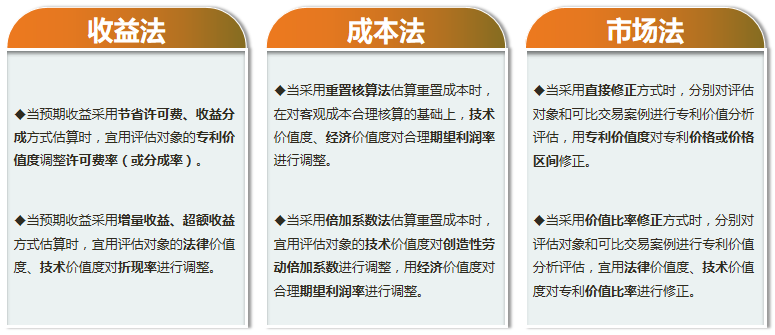 将专利价值度作为调节系数或参数,应用于收益法、成本法、市场法三种资产评估基本方法及其衍生方法,具体使用时应考虑分析专利价值分析评估指标与资产评估因素的关联关系,合理选择所需指标和因素,避免重复计算。具体如下图所示: