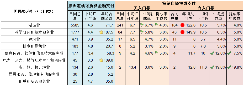 目前以5年为一个统计周期,2022年已发布2017-2021年相关统计数据,下表选取其中部分数据主要展示国民经济行业重点门类所涉及的按固定或可折算金额支付、按销售额提成支付两种类型的专利实施许可使用费率情况,表中各栏目下对应金额或提成率最高的两个行业分别用不同标记示出。
