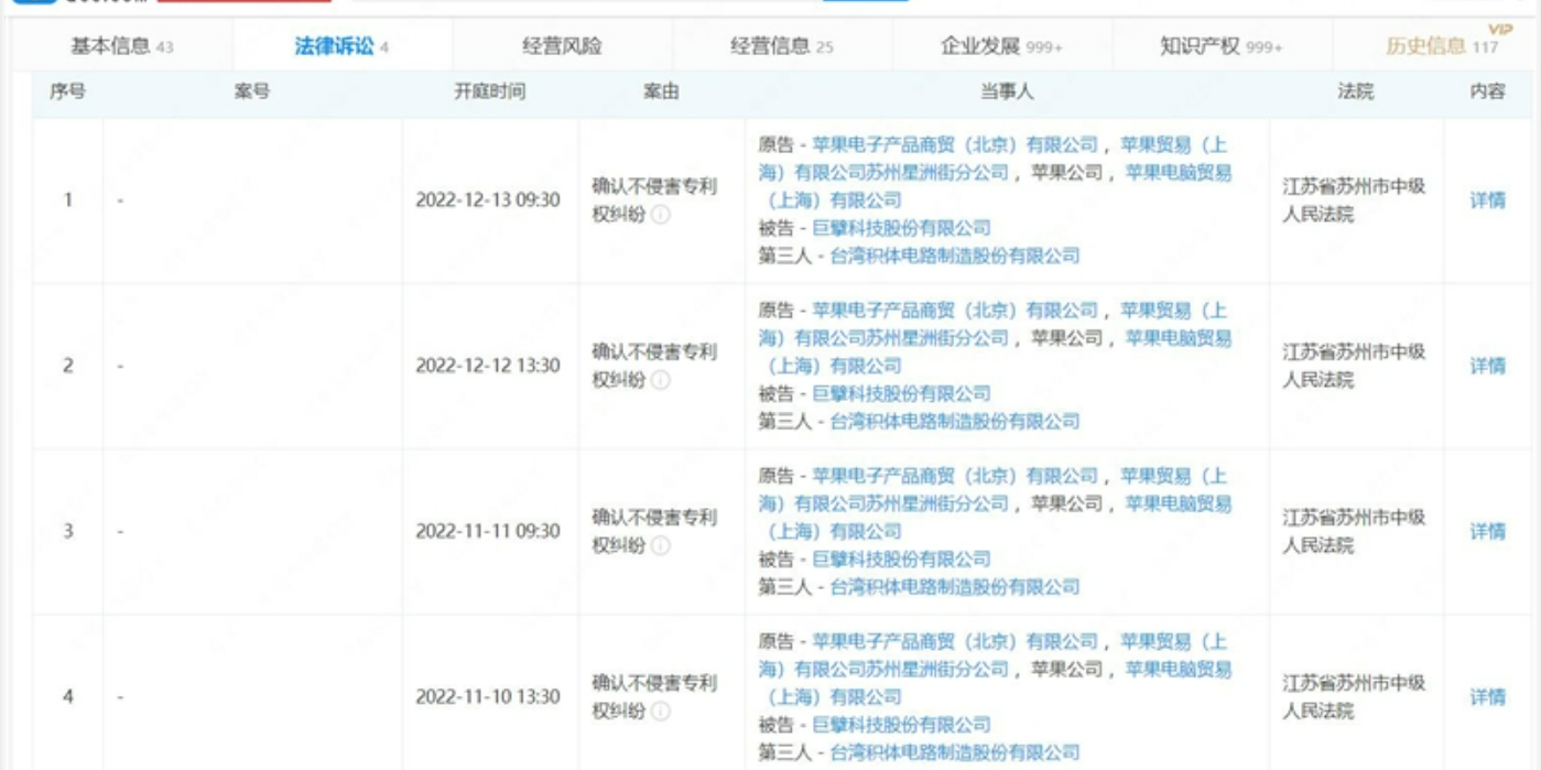 苹果公司起诉巨擘科技专利侵权,台积电为涉案第三人