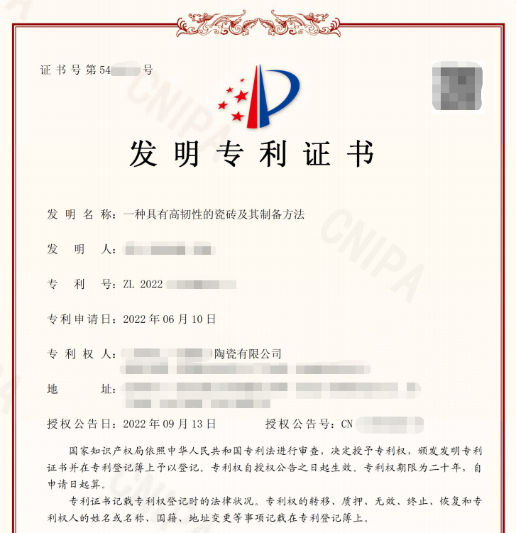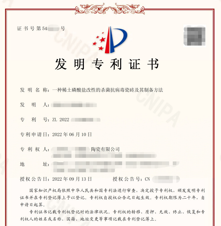 近日,由深圳市深可信专利代理《一种具有高韧性的瓷砖及其制备方法》、《一种稀土磷酸盐改性的杀菌抗病毒瓷砖及其制备方法》、《一种超疏水陶瓷砖及其制备方法》的组合物发明专利顺利通过国家知识产权局审查,获得国家发明专利授权。