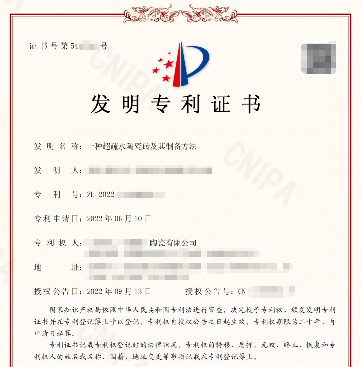 近日,由深圳深可信专利代理&某瓷砖公司的“组合物发明专利”《一种具有高韧性的瓷砖及其制备方法》、《一种稀土磷酸盐改性的杀菌抗病毒瓷砖及其制备方法》、《一种超疏水陶瓷砖及其制备方法》走快速预审,顺利通过国家知识产权局审查,仅历时三个月就获得发明专利授权取得证书!下方👇请下滑动查看更多哦~