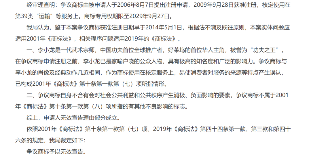 国家知识产权局审理认为,李小龙是一代武术宗师,中国功夫首位全球推广者,好莱坞的首位华人主角,被誉为“功夫之王”,在争议商标申请注册之前,李小龙已是家喻户晓的公众人物,具有极高的知名度和广泛的影响力。争议商标与李小龙的肖像及经典动作几近相同,作为商标使用在核定服务上,易使消费者对服务的来源等特点产生误认,已构成2001年《商标法》第十条第一款第(七)项所指情形(即夸大宣传并带有欺骗性的标志不得作为商标使用)。