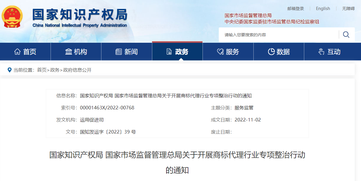 国知局 市监总局:开展商标代理行业专项整治行动!对通过网络从事商标代理业务的,重点检查其是否存在低于成本价格提供服务等行为