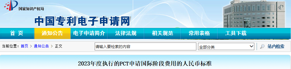 近日,中国专利电子申请网发布关于2023年度执行的人民币标准,根据世界知识产权组织公布的2023年度PCT申请国际阶段费用的人民币标准,国家知识产权局将按以下标准收取PCT申请国际阶段费用。