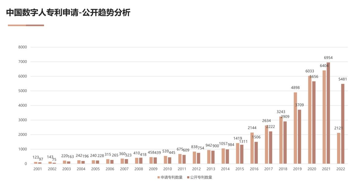 “智慧+”场景应用创造出更多产业增长点,新兴人工智能技术生成数字经济发展新动能。AI在城市、交通、医疗、教育及工业等场景的融合应用加速,不断催生新业态新模式新产业。以智慧工业为例,将工业互联网、人工智能等在内的智能制造新技术与工具,集成到工业生产流程中,正在引领我国工业数字化新生态。报告显示,截至2022年9月,我国智慧工业领域申请专利共计65万余件。百度公司以近9000件专利总数位居第一,国家电网位居第二,其余创新主体专利申请量差距不大,发展潜力较强,各创新主体在智慧工业领域的专利布局积极竞争,难以拉开较大差距。与此同时,基于人工智能的深度学习、内容生成,语音、视觉识别技术越来越成熟,以元宇宙和数字人技术为代表的新兴技术,也迎来了专利的快速积累阶段,百度、腾讯、华为等企业积极开展前沿专利布局,探索人机交互发展和应用,助力数字经济高质量发展。