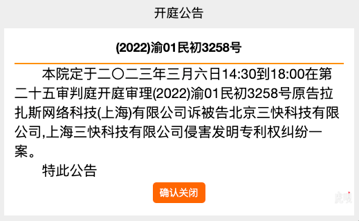重庆法院公众服务网显示,拉扎斯网络科技(上海)有限公司与北京三快科技有限公司、上海三快科技有限公司相关侵害发明专利权纠纷一案定于3月6日开庭,