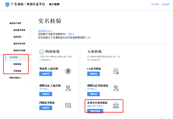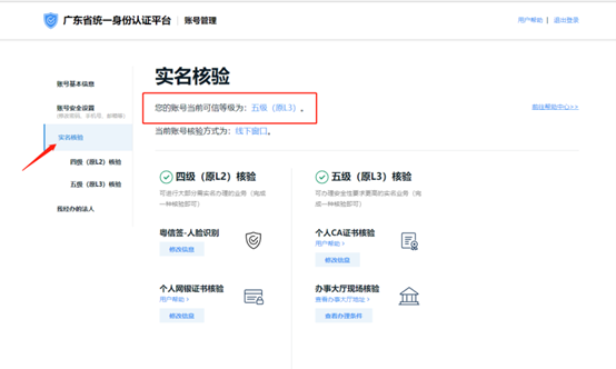 答:进入广东政务服务网(http://www.gdzwfw.gov.cn),使用账号登录后点击右上角【用户名称】→【账户管理】→【实名核验】中,查看目前可信等级以及了解对应等级进行核验升级的流程 。