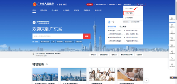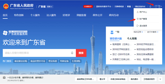 1.1 使用账号登录广东政务服务网,点击用户名(右上角)--账户管理进入账户管理页面。