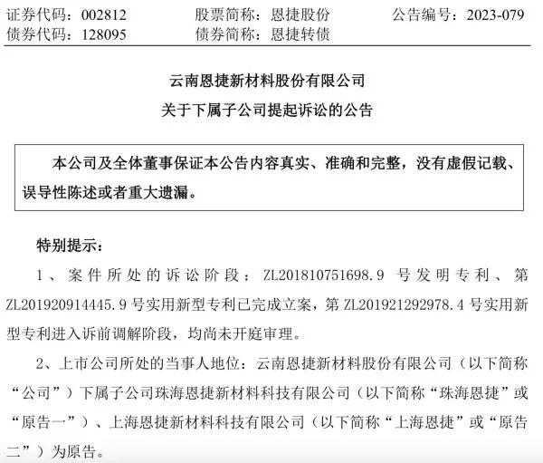 5月22日,恩捷股份披露公告称,公司下属子公司上海恩捷、珠海恩捷就河北金力新能源科技股份有限公司及相关方侵害公司发明专利权、实用新型专利权纠纷分别向石家庄市中级人民法院、广州知识产权法院提起诉讼。