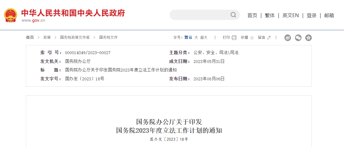 近日,中国政府网发布《国务院2023年度立法工作计划》,立法项目涉及: