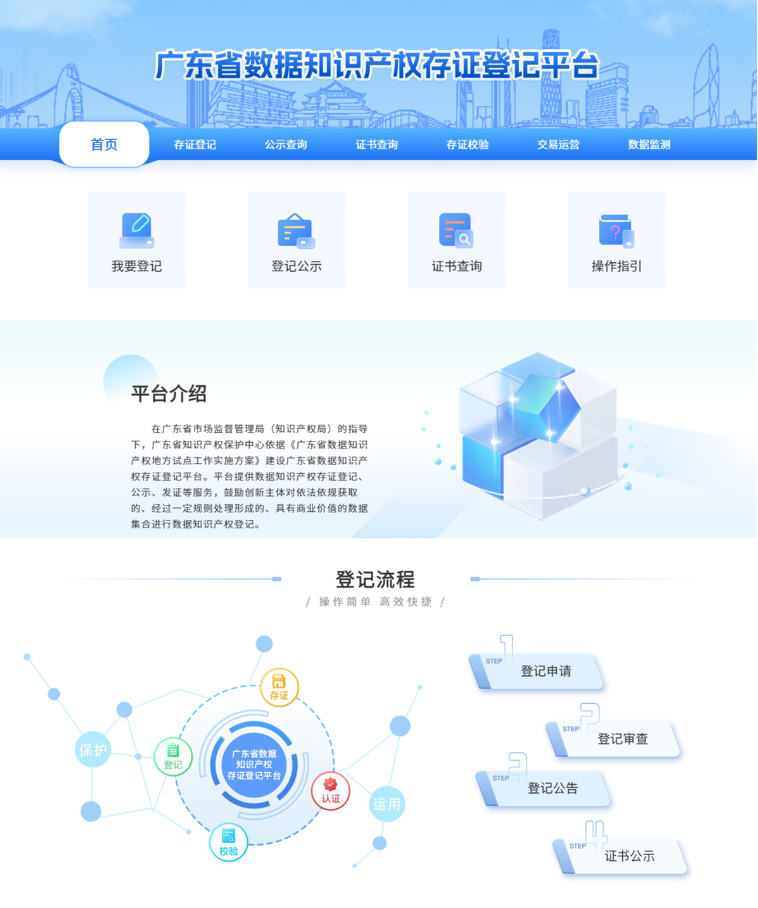 2022年11月,经国家知识产权局批准,广东成为全国首批8个开展数据知识产权地方试点工作的省份之一。试点工作开展以来,广东省市场监管局(知识产权局)围绕数据知识产权基础制度构建、登记实践、权益保护和交易使用等关键性问题上开展理论和实践探索,建设广东省数据知识产权存证登记平台(http://data.gpic.gd.cn),平台于2023年7月28日正式上线运行。