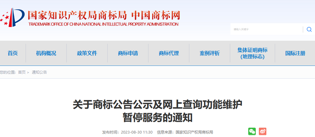 关于商标公告公示及网上查询功能维护暂停服务的通知