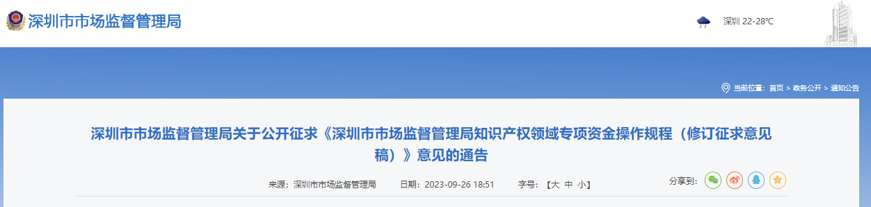 深圳市市场监督管理局关于公开征求《深圳市市场监督管理局知识产权领域专项资金操作规程(修订征求意见稿)》意见的通告