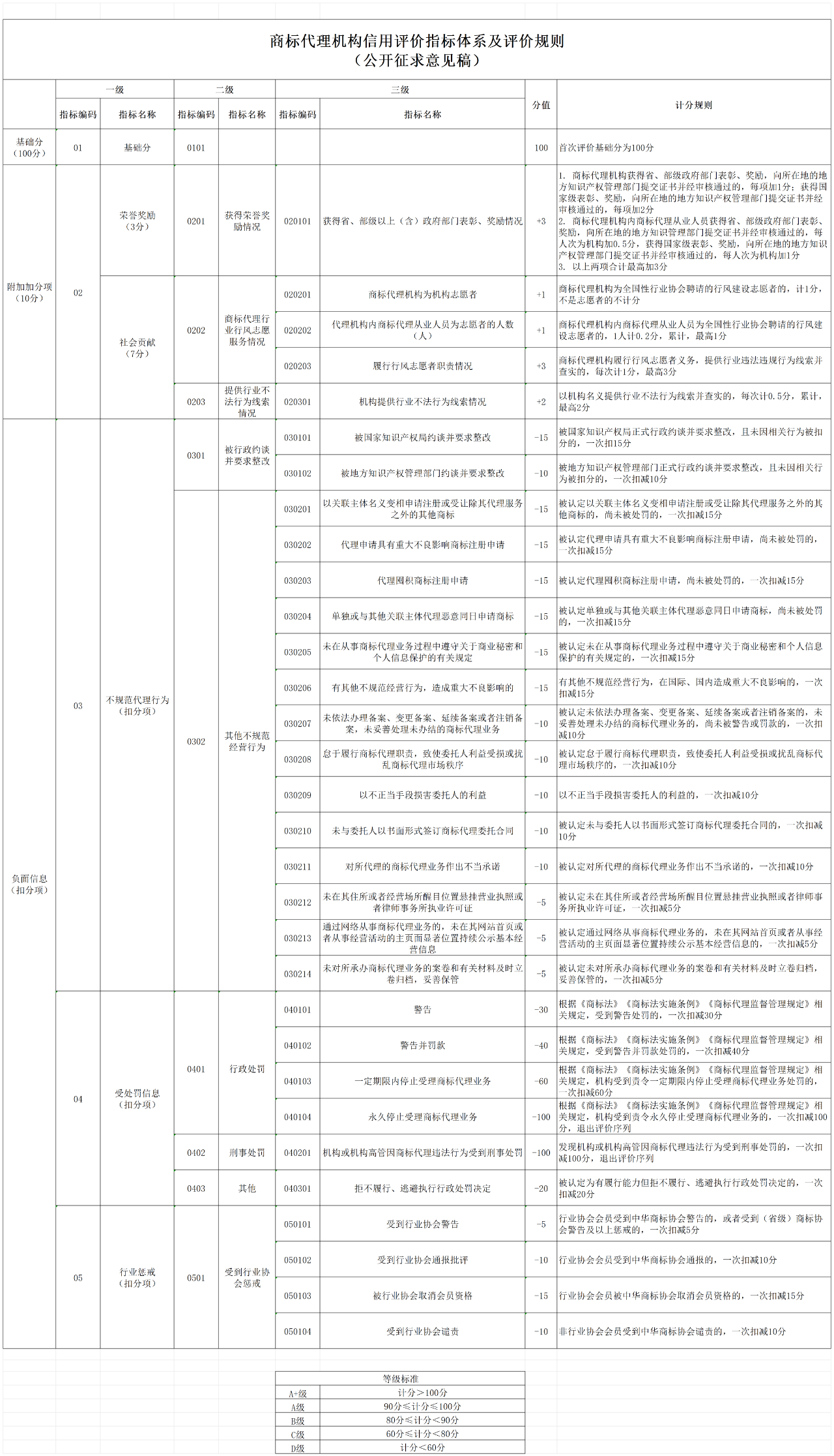 第五条 商标代理机构和商标代理从业人员信用等级按照从高到低顺序分为 “A”、“B”、“C”、“D”级,按计分情况评价。计分满分为100分,根据负面信息予以扣减。负面信息包括不规范经营或代理行为、受行政或刑事处罚、行业惩戒等情况。等级标准如下: