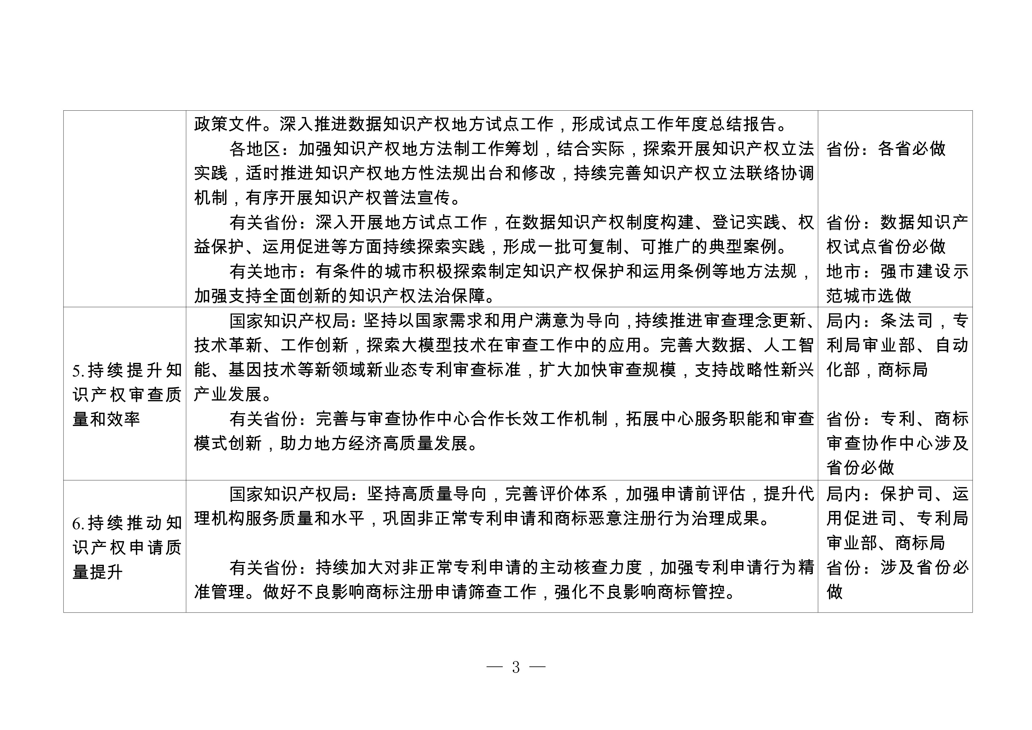 (五)加强法治保障和宏观政策供给。大力推进法治建设,深入宣传贯彻新修改的《中华人民共和国专利法实施细则》和《专利审查指南》。加快推进商标法及其实施条例新一轮修订、地理标志专门立法研究和《集成电路布图设计保护条例》修改论证。有效落实《地理标志产品保护办法》和《集体商标、证明商标注册和管理规定》。完成《国家知识产权局行政复议规程》修改。持续加强知识产权地方立法工作指导。(条法司负责)持续推进《商标审查审理指南》动态修改。(商标局负责)推动构建数据知识产权保护规则,研究制定数据知识产权政策文件,深化地方试点。(战略规划司负责)加强知识产权宏观政策供给,对具有普遍性和制度性的关键性问题开展深入分析和调查研究。围绕知识产权助力打造新质生产力,谋划研究一批针对性强的储备政策。(局机关各部门按职责分工负责)
