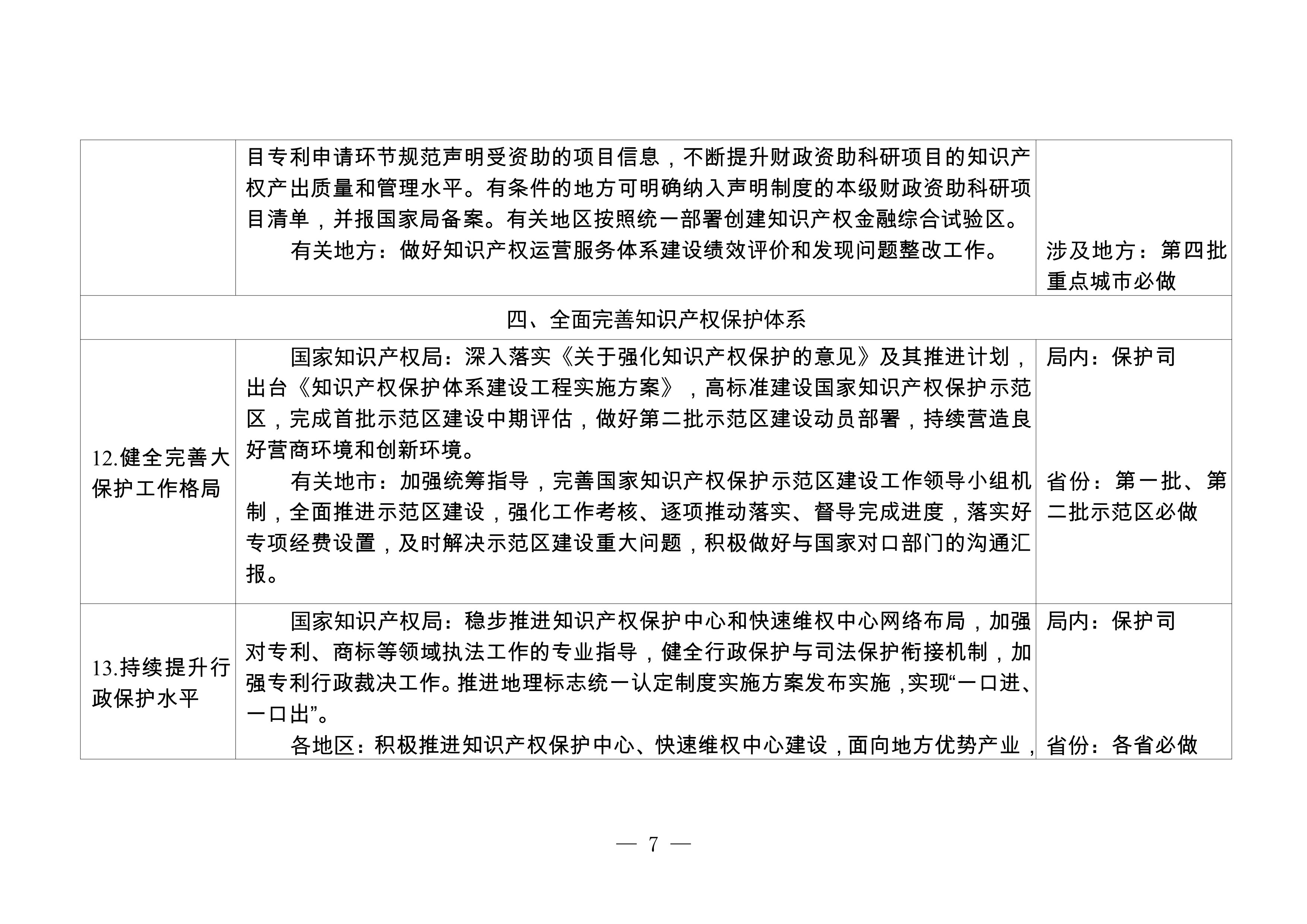 (七)健全知识产权保护政策。深入落实《关于强化知识产权保护的意见》及其推进计划,研究出台《知识产权保护体系建设工作实施方案》。会同有关部门做好国家知识产权保护示范区建设工作,完成首批示范区建设中期评估,做好第二批示范区建设动员部署。推进完善知识产权快速协同保护体系,有序新建一批国家级知识产权保护中心和快速维权中心。推进知识产权纠纷快速处理试点工作。研究制定专利纠纷行政裁决和调解办法,加强重大专利侵权纠纷和药品专利纠纷早期解决机制行政裁决办案工作。研究制定关于加强涉外知识产权保护工作的意见。启动实施地理标志保护工程,推进地理标志统一认定制度实施方案发布实施。(保护司负责)