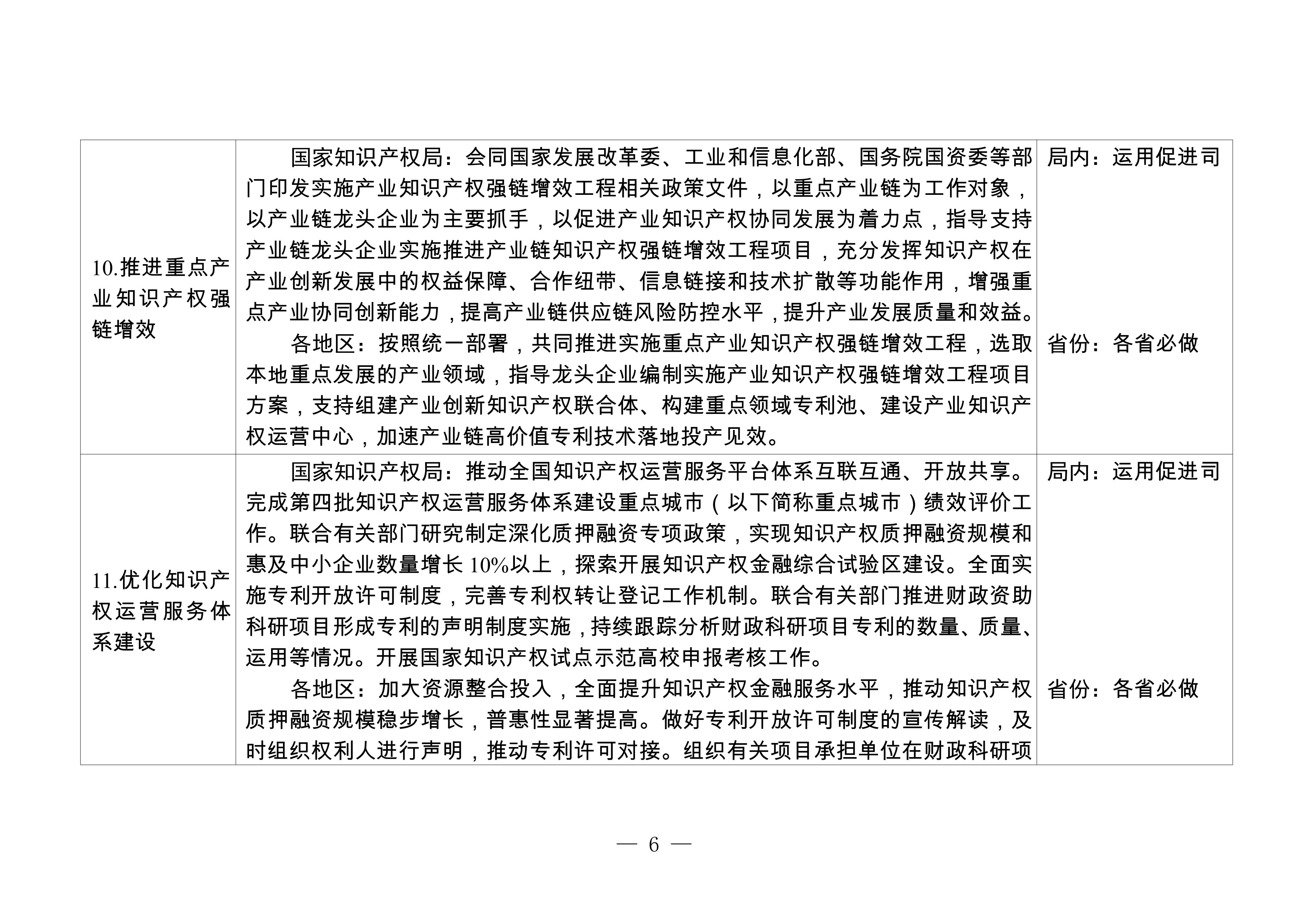 ——知识产权运用。全面推进专利转化运用专项行动,力争年底前实现全国高校和科研机构未转化有效专利盘点全覆盖,一批高价值专利实现快速转化,知识产权质押融资规模和惠及中小企业数量增长10%以上,全国专利密集型产业增加值占国内生产总值比重稳步提高。