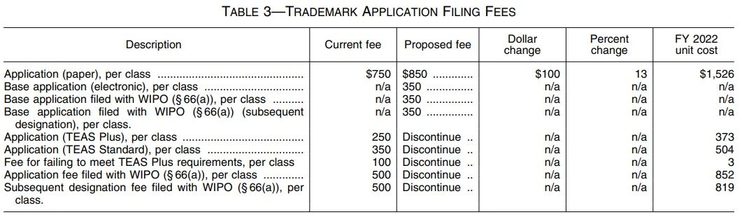 其中,规范申请(TEAS Plus)和非规范申请(TEAS Standard),将统一调整为350美元/类。相当于每类美标的成本都要增加100美元,涨幅高达40%。此外,美国专利商标局提议使用一个单一的电子申请提交选项,将不再区分规范申请(TEAS Plus)和非规范申请(TEAS Standard)。