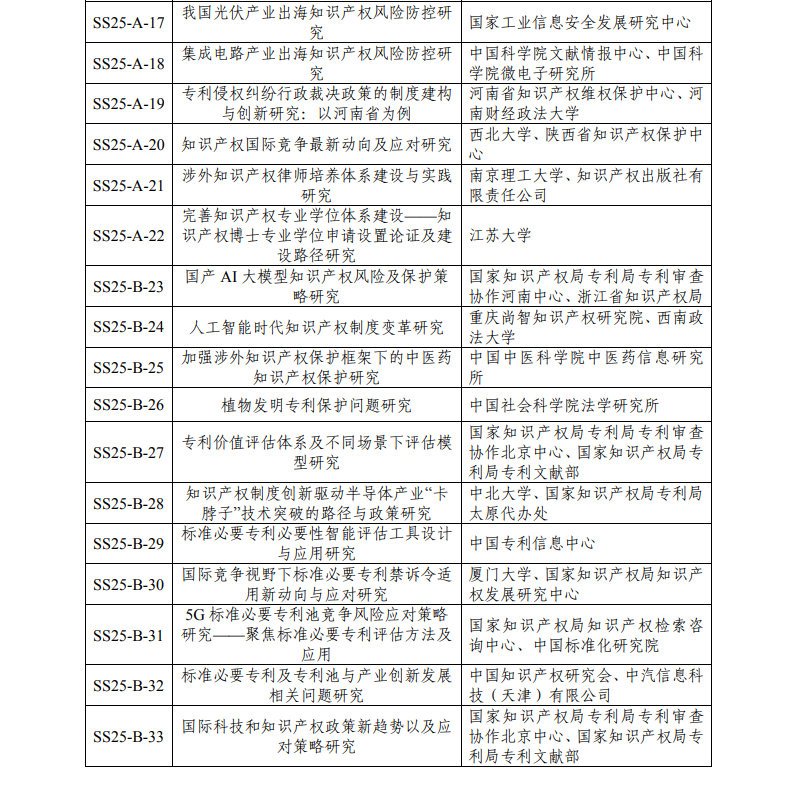 国家知识产权局办公室关于印发2025年度软科学研究项目立项名单的通知