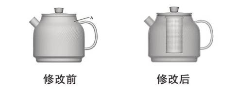 (4)增加因透明材质而可见的设计内容。如图6所示“茶壶”的外观设计视图,申请日提交的视图中标注了产品表面为透明材质,修改后的视图删除了透明材质的标注,增加了因透明材质可见的产品内部的过滤结构,虽然该过滤结构在其产品领域内属于较为常见的设计内容,但该部分结构在申请日提交的图片或者照片中未表示,并且不能直接地、毫无疑义地确定,因此属于超范围的修改。