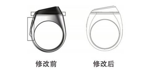 (2)改变视图形式。如图12所示“戒指”的外观设计视图,将申请日的照片视图修改为绘制视图,产品上部结构线、左侧外轮廓的形状以及色彩等多处发生了改变,修改后的外观设计与申请日的外观设计明显不同,超出了原图片或者照片表示的范围。