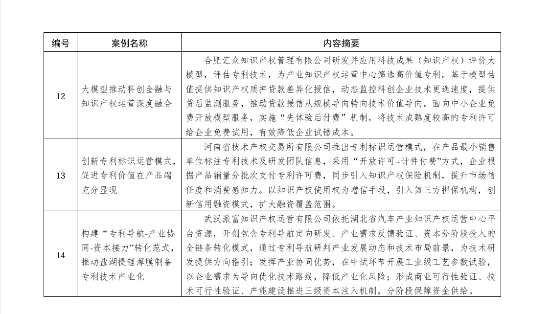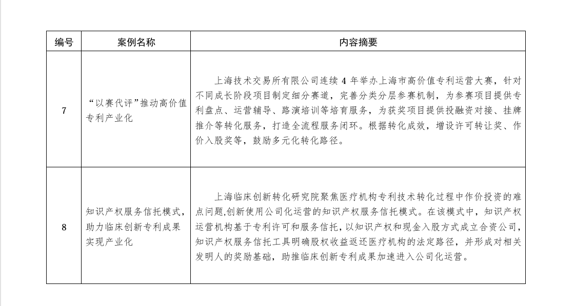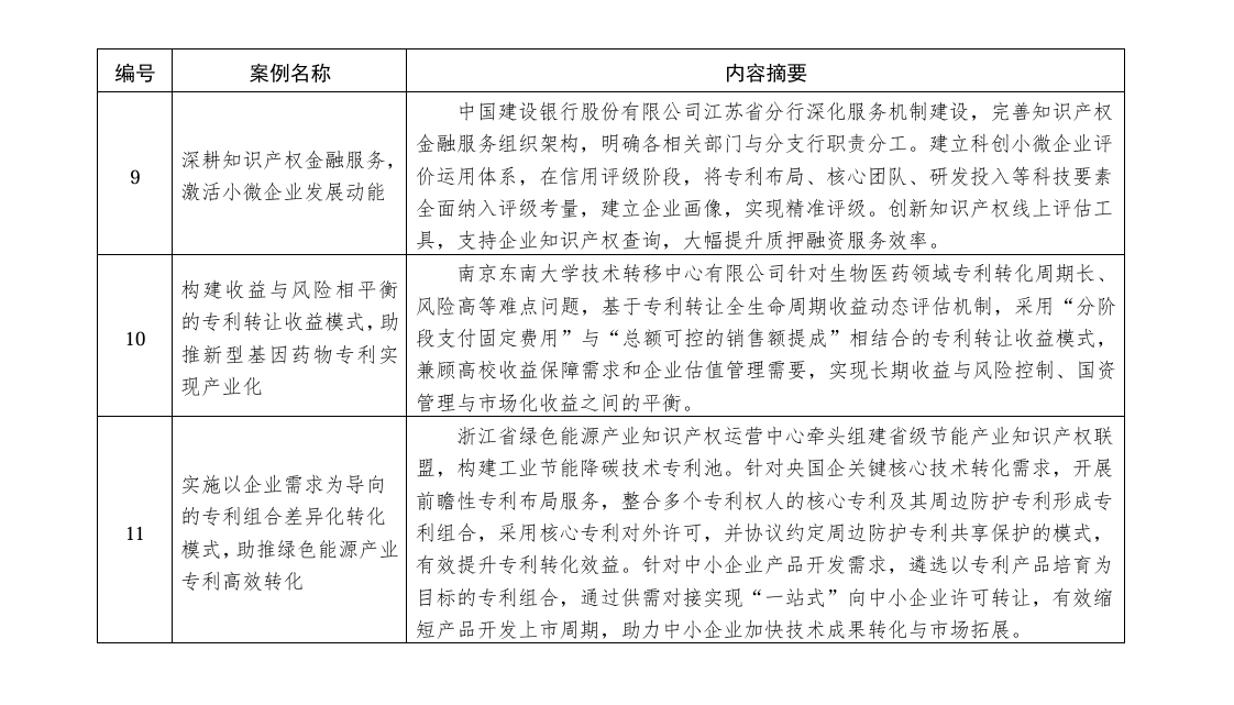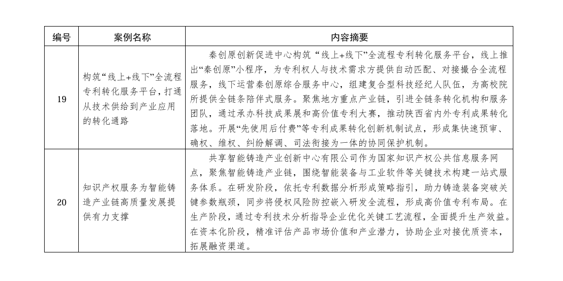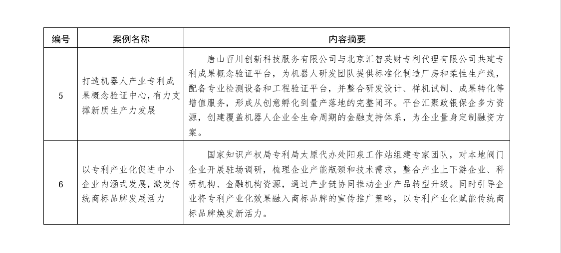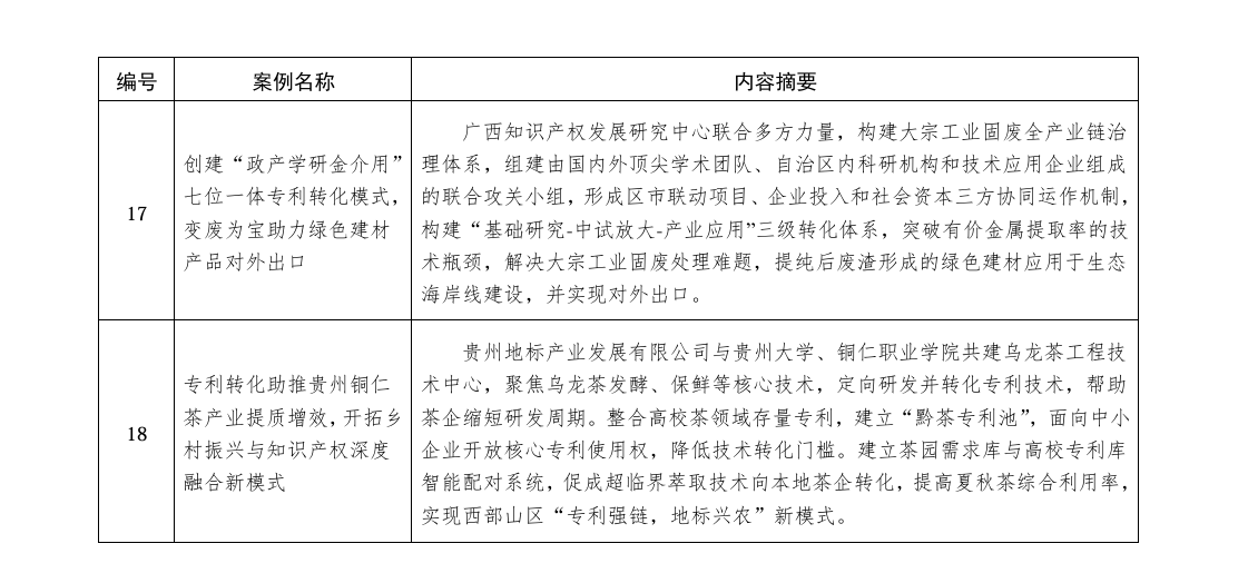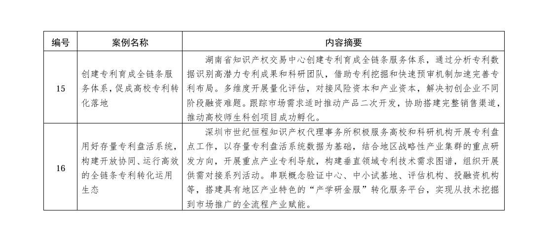 上述案例体现了各地区各部门指导服务机构在推进专利转化运用专项行动重点任务落地过程中的有益实践,创新性强、成效突出,具备复制推广价值。请各省级知识产权局积极宣传推广案例,组织高校和科研机构、企业、服务机构等各类主体开展交流学习,借鉴先进经验,大力推动专利产业化,加快创新成果转化。